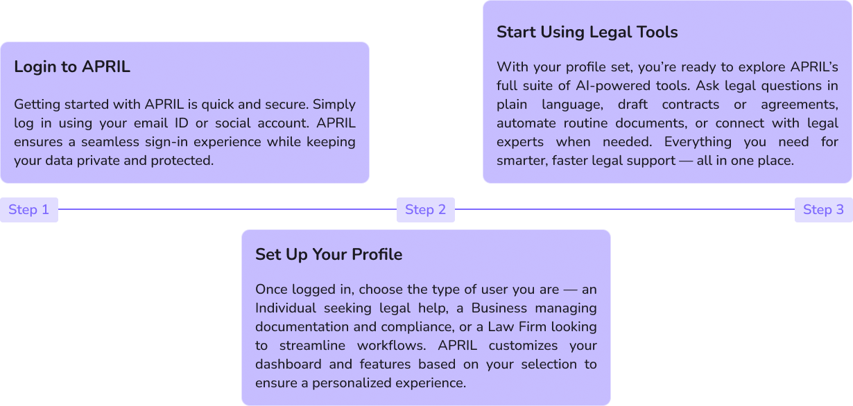We’ve designed APRIL to be intuitive and user-friendly, even for those with no legal or technical background. Simply type in your concern in plain language, and APRIL understands it — no jargon, no complexity. Legal help has never been this easy.